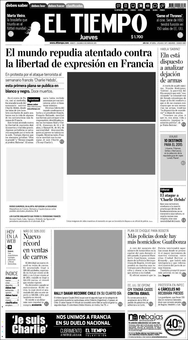 El diario El Tiempo de Colombia se sumó a la indignación mundial por el atentado ayer contra el semanario satírico Charlie Hebdo en Francia, que dejó 12 personas muertas y heridos de gravedad. El periódico colombiano publicó este jueves, “en homenaje a los colegas franceses víctimas del terrible episodio”, su portada en blanco y negro.